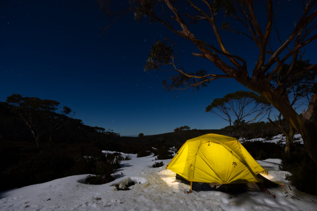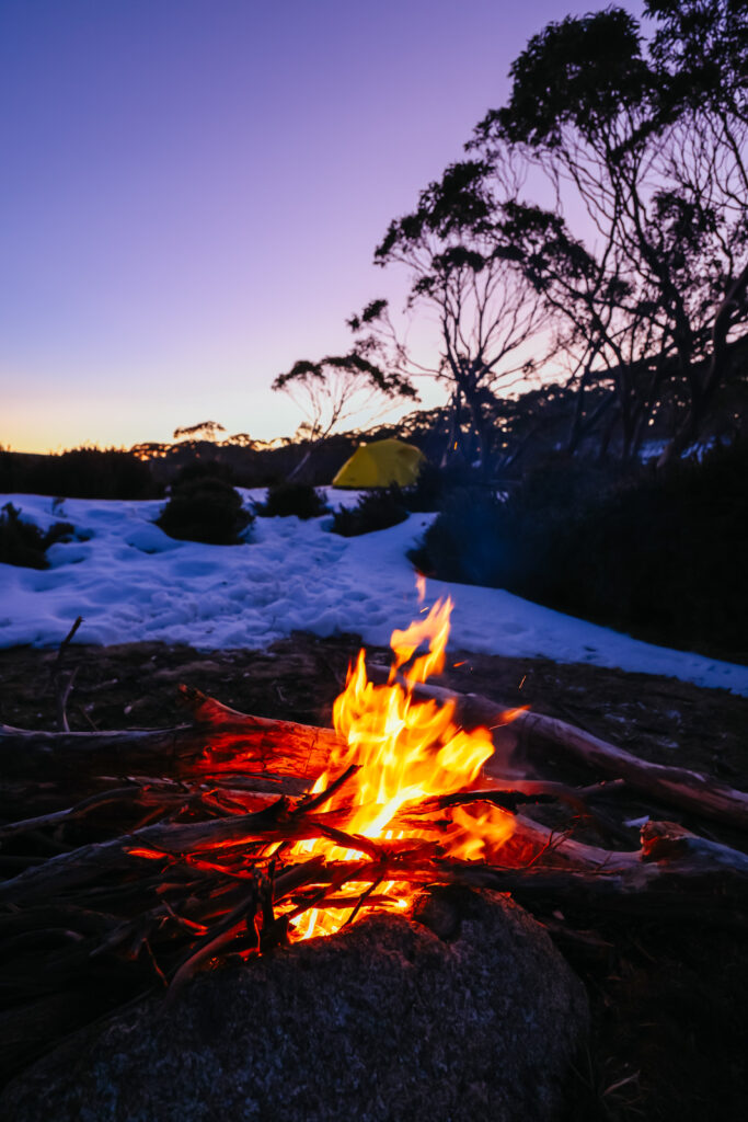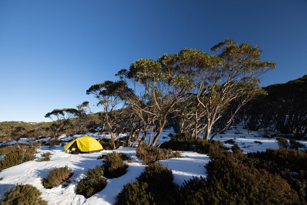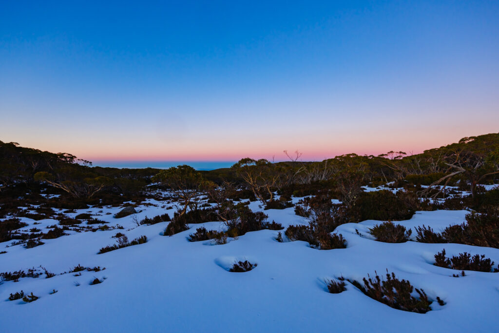 Being my first time camping in the snow I had no idea how I would sleep. I did need all my layers but overall I was warm and comfortable. I didnt have an exact plan for waking up for sunrise but I was glad I naturally woke early. I poked my head out and had the most beautiful sunrise. The sun was poking above the horizon in the east, and to the west, a wonderful pink sky over Mt Baw Baw