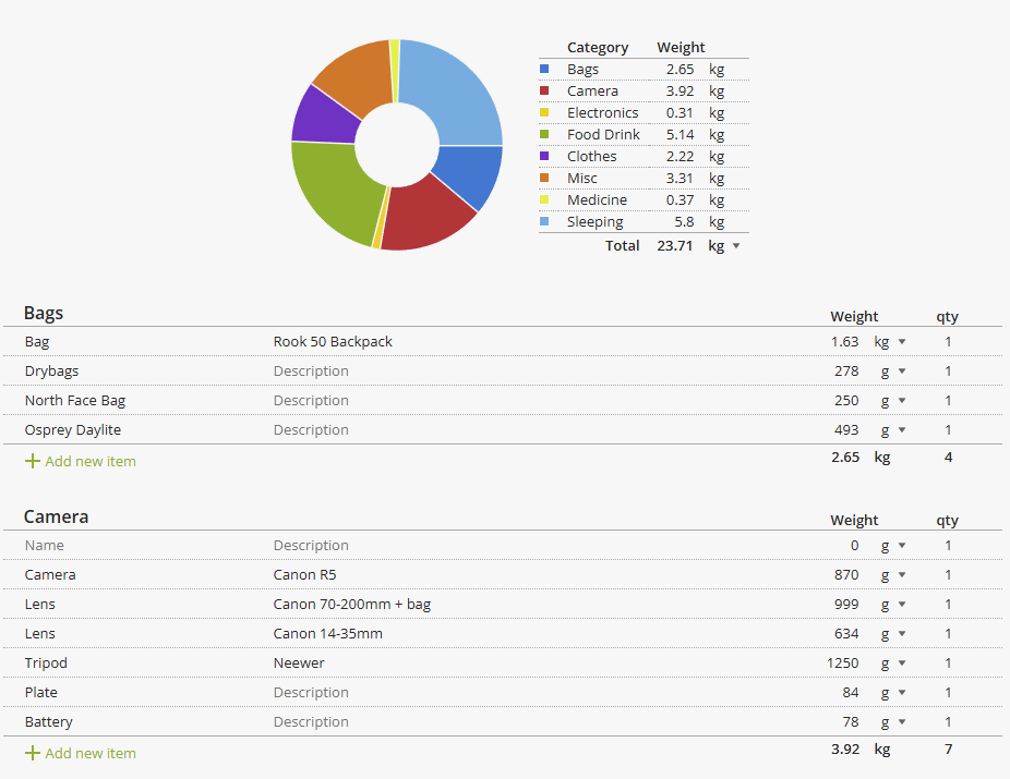My gear choice is becoming pretty locked in now with the R5, a 14-35 F4 and the 70-200 F4. A lot of gear for minimal weight. My OCD gear measuring can be seen below. It is important to keep close check of weight not only for the obvious but also to provide a check list for future trips. I used lighterpack.com for the Overland track and was able to clone the file for this trip. I highly recommend.