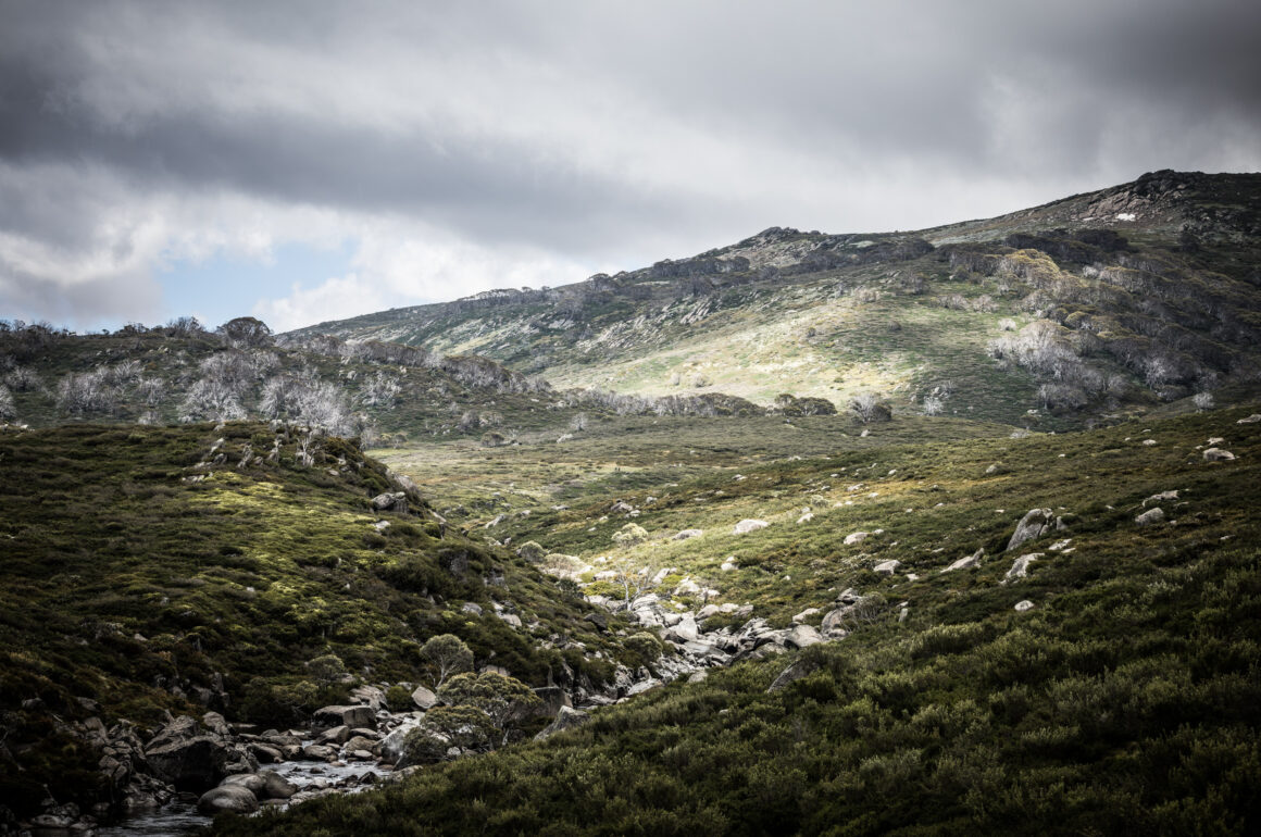 This image was taken on a mixed weather day on the Illawong walk out of the small ski resort town of Guthega. This trail forms part of the new Snowies Alpine Walk. We stopped for lunch at the Illawong swing bridge and I finally found some time to switch to my 70-200mm lens and focus on parts of the landscape. Light was seeping thru the clouds, creating beautiful light and dark patches on the spectacular scenery of the Snowy River. The grey gritty alpine Australian landscape at its very best.